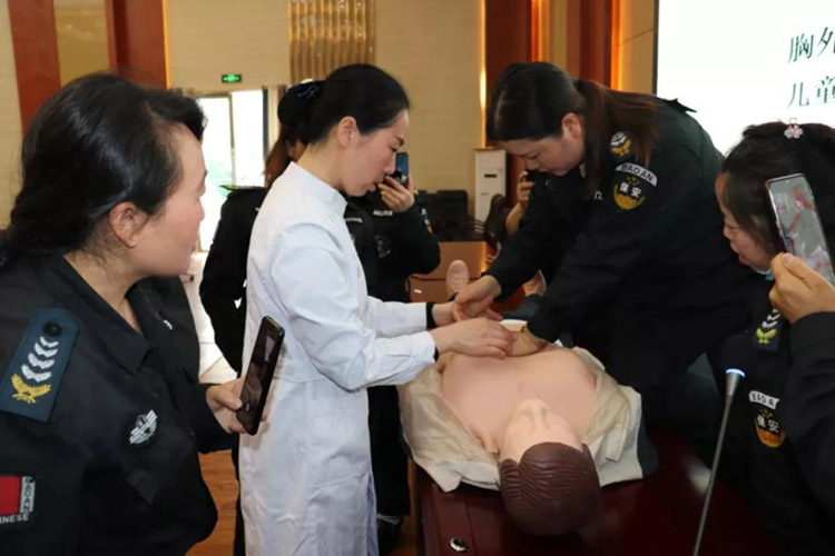 首先由新舟鎮(zhèn)衛(wèi)生院護(hù)士長一行人員為參訓(xùn)保安員講解急救要領(lǐng),現(xiàn)場(chǎng)演示徒手心肺復(fù)蘇操作技巧,并要求每位保安員實(shí)操練習(xí)。