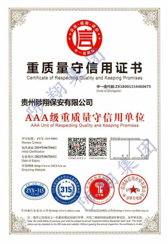 > 重質(zhì)量守信用證書