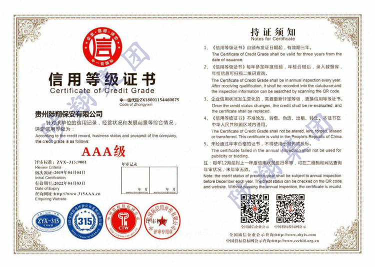 信用等級證書AAA級