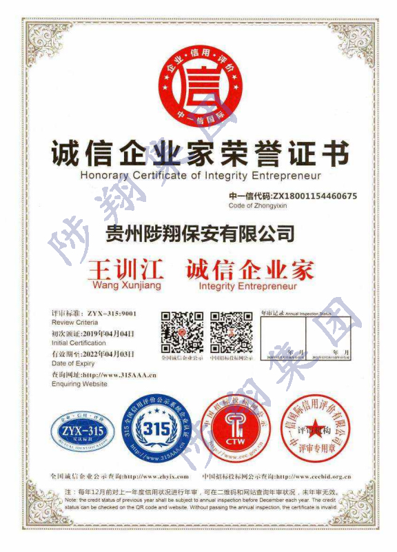 誠信企業(yè)家榮譽證書